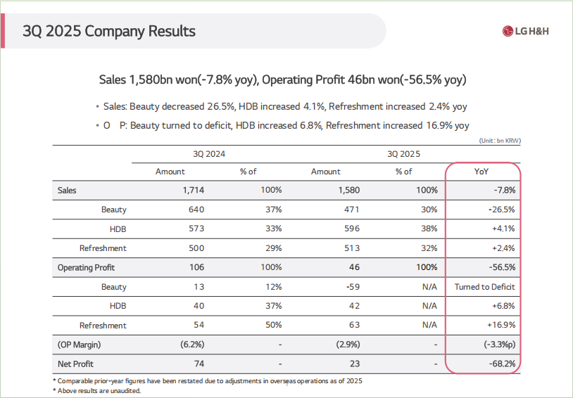 据财报信息,2025年前三季度,LG生活健康实现销售额48830亿韩元(约合人民币234.38亿元),同比下降6.1%,营业利润2430亿韩元(约合人民币11.66亿元),同比下滑41.4%。